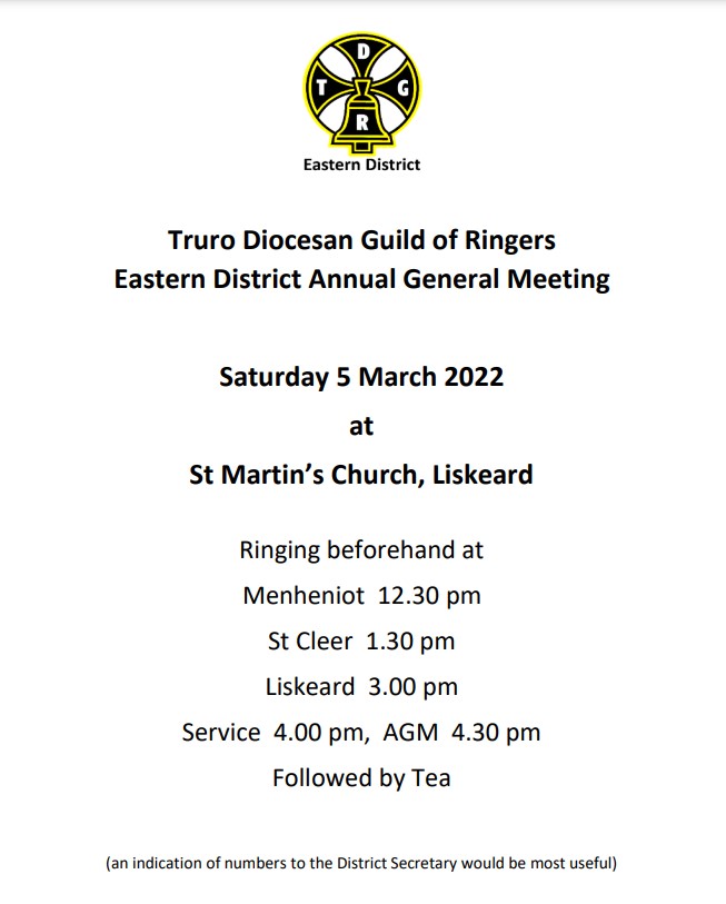 This year’s AGM will take place on Saturday 5th March at St Martin’s Liskeard, thanks to Jenny Stott for arranging this, there will be a little pre-ringing at St Cleer, courtesy of Ian Banbury, as well as at St Martin’s.