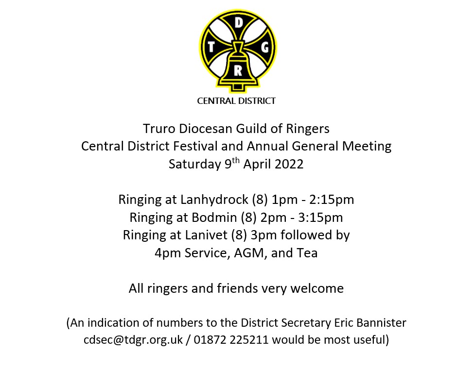 Truro Diocesan Guild of Ringers Central District Festival and Annual General Meeting Saturday 9th April 2022 Ringing at Lanhydrock (8) 1pm - 2:15pm Ringing at Bodmin (8) 2pm - 3:15pm Ringing at Lanivet (8) 3pm followed by 4pm Service, AGM, and Tea All ringers and friends very welcome Contributions would be greatly appreciated for the […]