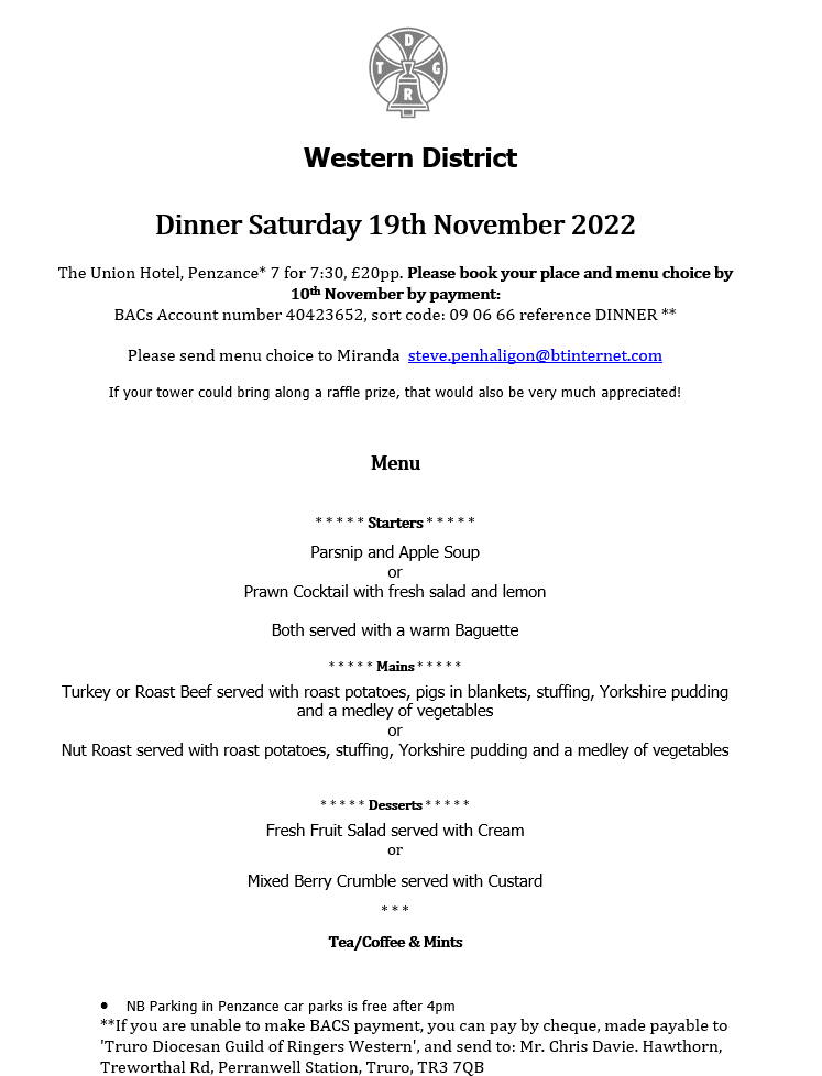 Western District Dinner Saturday 19th November, 2022 The Union Hotel, Penzance* 7 for 7:30, £20pp. Please book your place and menu choice by 10th November by payment: BACs Account number 40423652, sort code: 09 06 66 reference DINNER ** Please send menu choice to Miranda steve.penhaligon@btinternet.com If your tower could bring along a raffle prize, […]